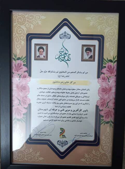 سرکار خانم زهره دانشوربا هماهنگی اموربانوان فرمانداری شهرستان وخیریه بین المللی آبشار عاطفه ها ازبین مربیان و زنان شاغل به عنوان کارآفرین ومربی برتردر سطح شهرستان شناخته شده ضمن عرض تبریک برای ایشان موفقیت وسربلندی آرزومندیم روابط عمومی مرکز اموزش فنی وحرفه ای آباده